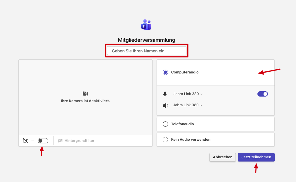 - Bitte sorge für eine möglichst stabile Internetverbindung und teste Mikrofon, Lautsprecher und ggf. Kamera vor Beginn der Versammlung. Hierfür kannst du den Teilnahmelink auch schon vor Versammlungsbeginn aufrufen und im Warteraum deine Einstellungen testen.