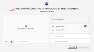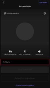 - Wenn du dem Teilnahmelink folgst, wirst du aufgefordert, deinen Namen einzugeben. Bitte nutze hierfür deinen Klarnamen (Vor- und Nachname), der uns bekannt ist. Anhand dessen prüfen wir deine Berechtigungen.